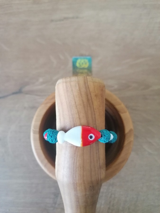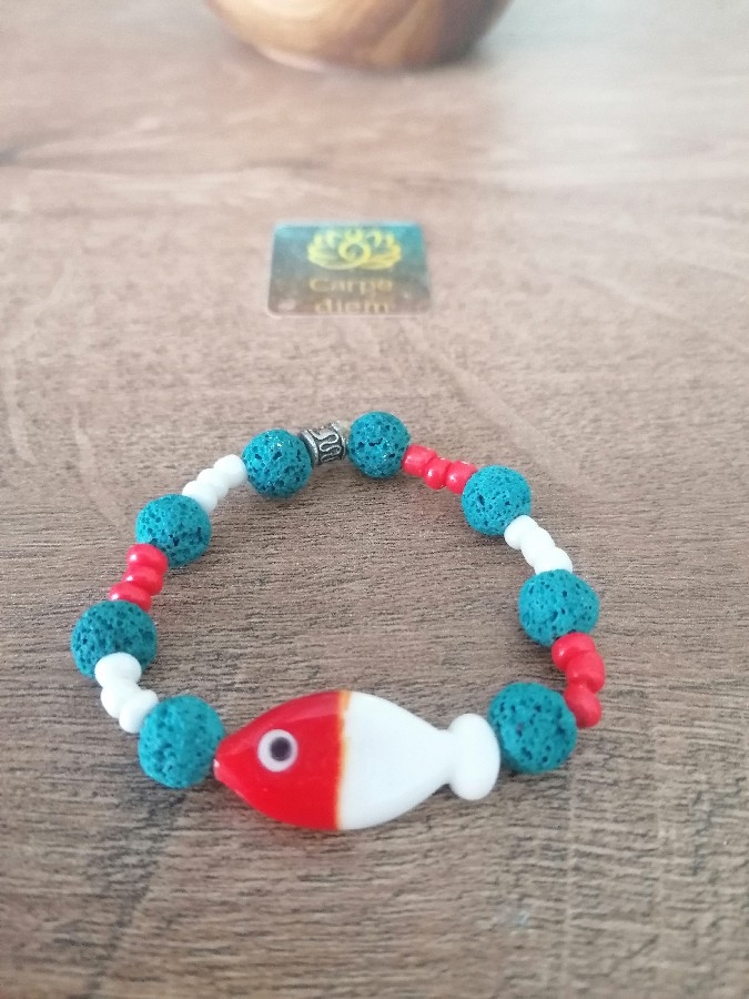 Bu bilezik lav taşı, kum boncuk ve balık cam boncuk kullanılarak tasarlandı. Esnek misinalıdır. 5 - 6 - 7 ve 8 yaşındaki çocuklar için uygundur💙. Siparişinizi iki iş günü içinde kargoluyorum.