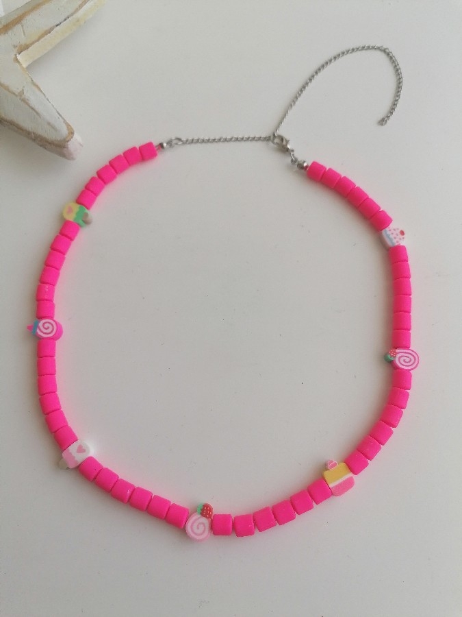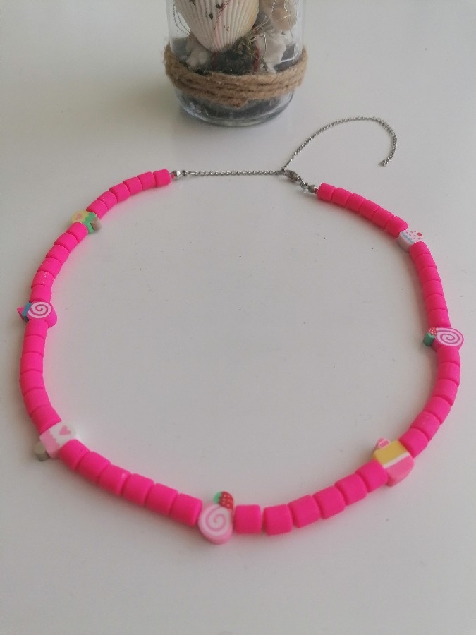 Pembe ve desenli fimo hamuru kullanarak yaptım. Küçük bir kız çocuğu gibi tatlı ve naif💙🧿🙏. Uzatma zinciri sayesinde boyunu ayarlayabilirsiniz. Siparişinizi iki iş günü içinde kargoluyorum.