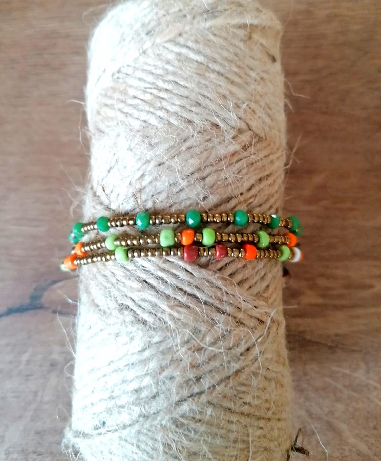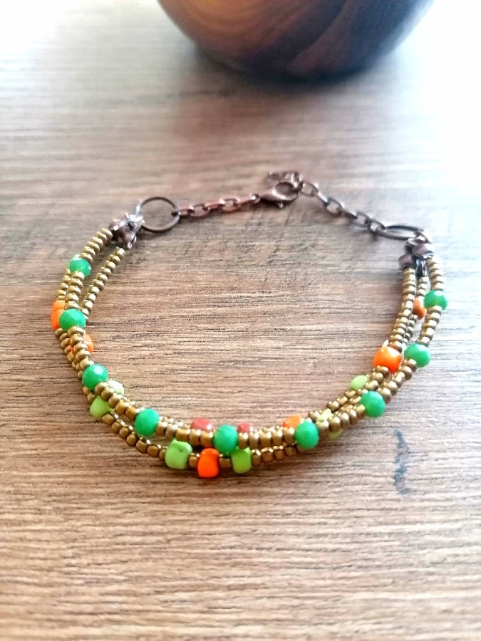 Kum boncuk ve kristal boncuk kullanarak tasarladım. 3 katmanlı olduğu için bilekte sanki üç bilezik takılmış hissi yaratıyor. Uzatma halkası sayesinde bileğinizin kalınlığına göre ayarlayabilirsiniz. Sioarişinizi iki iş günü içinde kargoluyorum