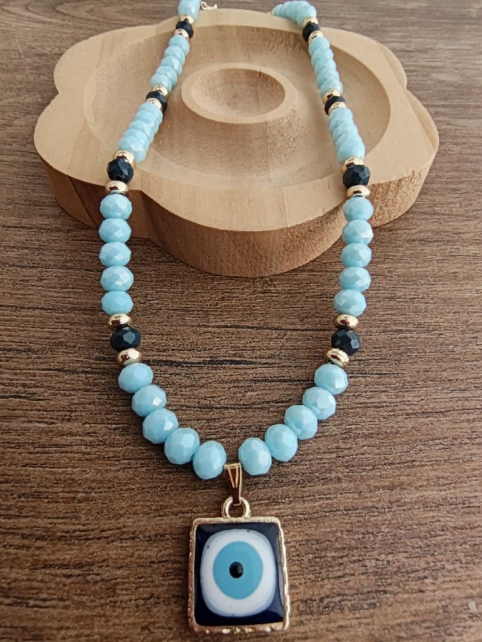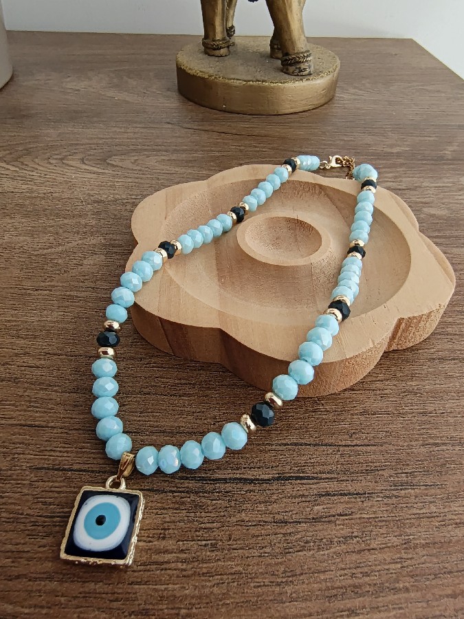 ✨ Zarif detayları ve anlam yüklü tasarımıyla öne çıkan bu özel kolye, mavi tonların huzurunu ve nazar boncuğunun koruyucu sembolünü bir araya getiriyor. 🧿 El yapımı bu kolye; doğal taş görünümlü kristal boncuklar, siyah detaylar ve altın renkli aparatlar ile modern ve şık bir stil sunar. Günlük kullanımda sade bir şıklık katarken, özel günlerde de dikkat çekici bir tamamlayıcıdır. 💙 Ürün Özellikleri: El yapımı tasarım Mavi kristal boncuklar Nazar boncuklu kolye ucu Altın renkli aparatlar Hafif ve konforlu kullanım