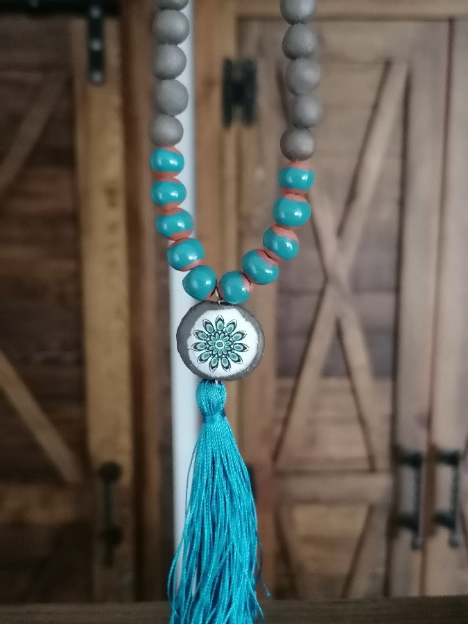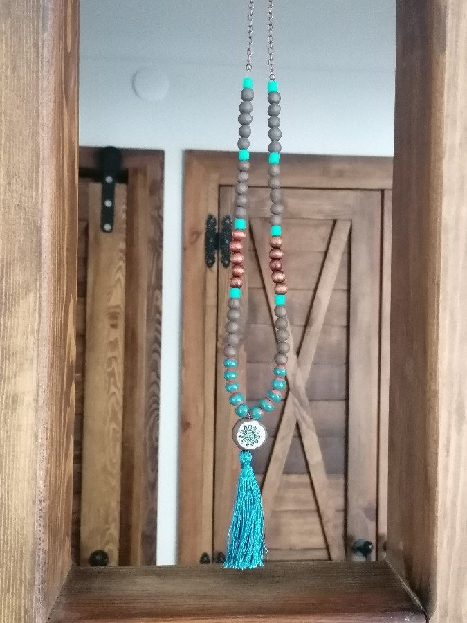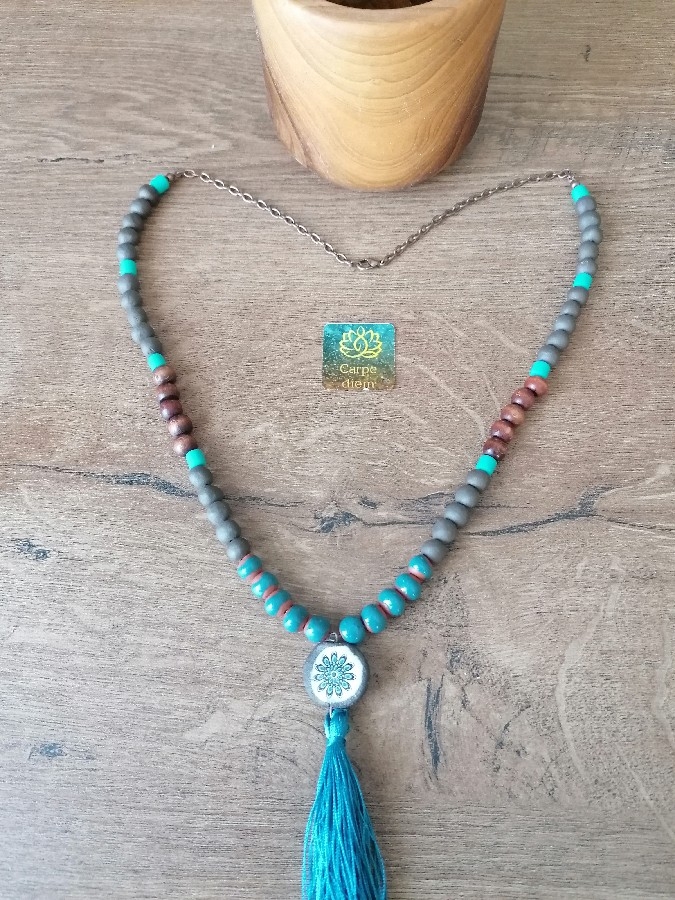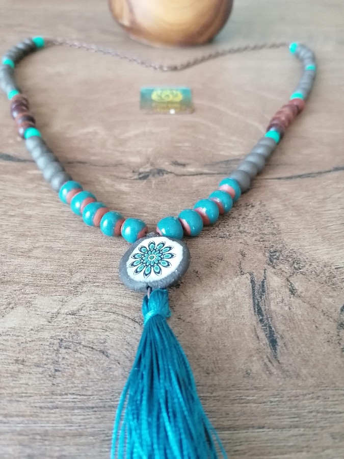 Toprak boncuk, ahşap boncuk, fimo boncuk ve püskül kullanarak tasarladım. Bakır uzatma halkası sayesinde boyunu ayarlayabilirsiniz 📿. Siparişinizi iki iş günü içinde kargoluyorum.
